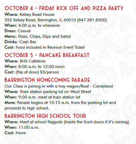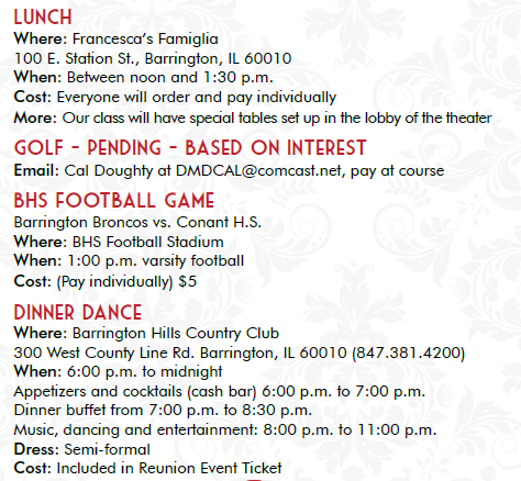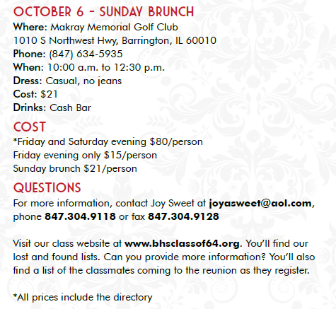 In planning ahead for the 60 th Class Reunion, we would like to set up a seed fund. Donations for this can be sent to Joy Sweet, 92 Meadow Hill Rd. , Barrington Hills , IL 60010 . Make checks payable to “Joy Sweet – Class of 64”.